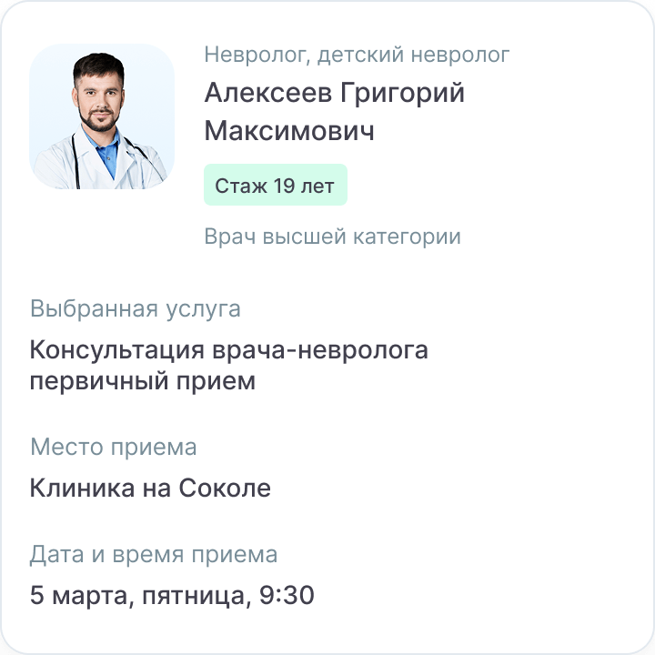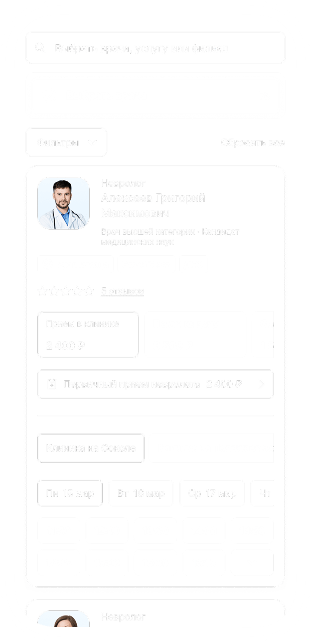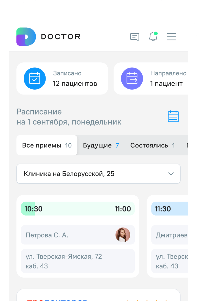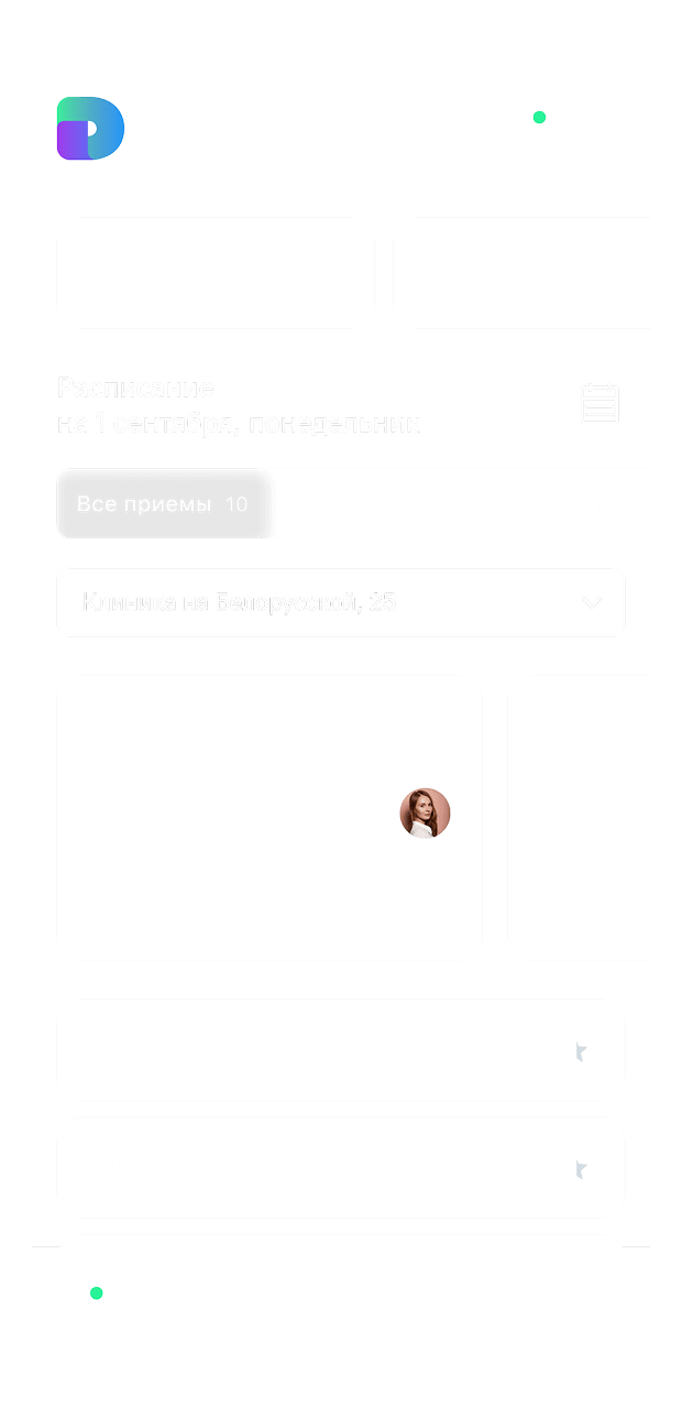 Личный кабинет врача объединяет расписание, пациентов и приёмы в одном интерфейсе. Упрощает ведение записей и снижает рутину.