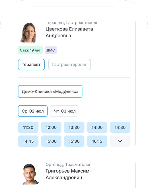 Прямая интеграция с МИС, запись через МедФлекс или простая форма на сайте. Пациент выбирает привычный способ, а клиника получает единые статусы и порядок в расписании.